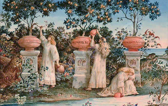 The painting below is by Ricciardo Meacci (1894). It depicts the three Hesperides in their garden. The three are sometimes called Western Maidens or Daughters of Evening. In Roman mythology, they are Daughters of Hesperus, personification of the Evening Star. Their mission was to mind Hera’s orchard, to prune and water the trees. The apples would bestow immortality on anyone who ate them.